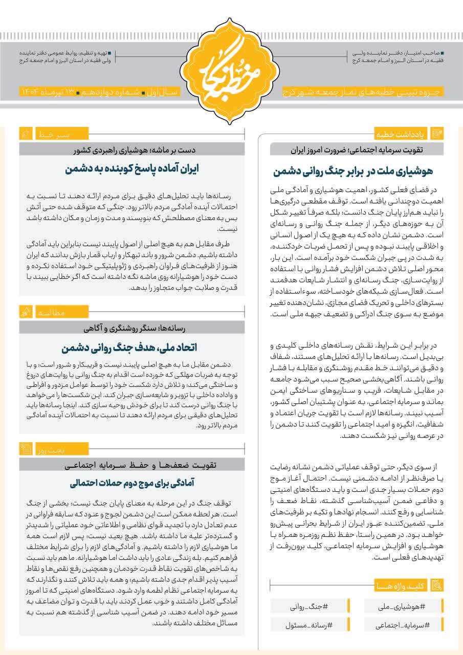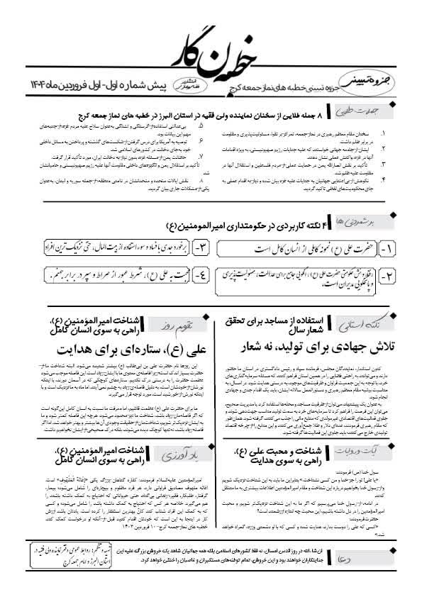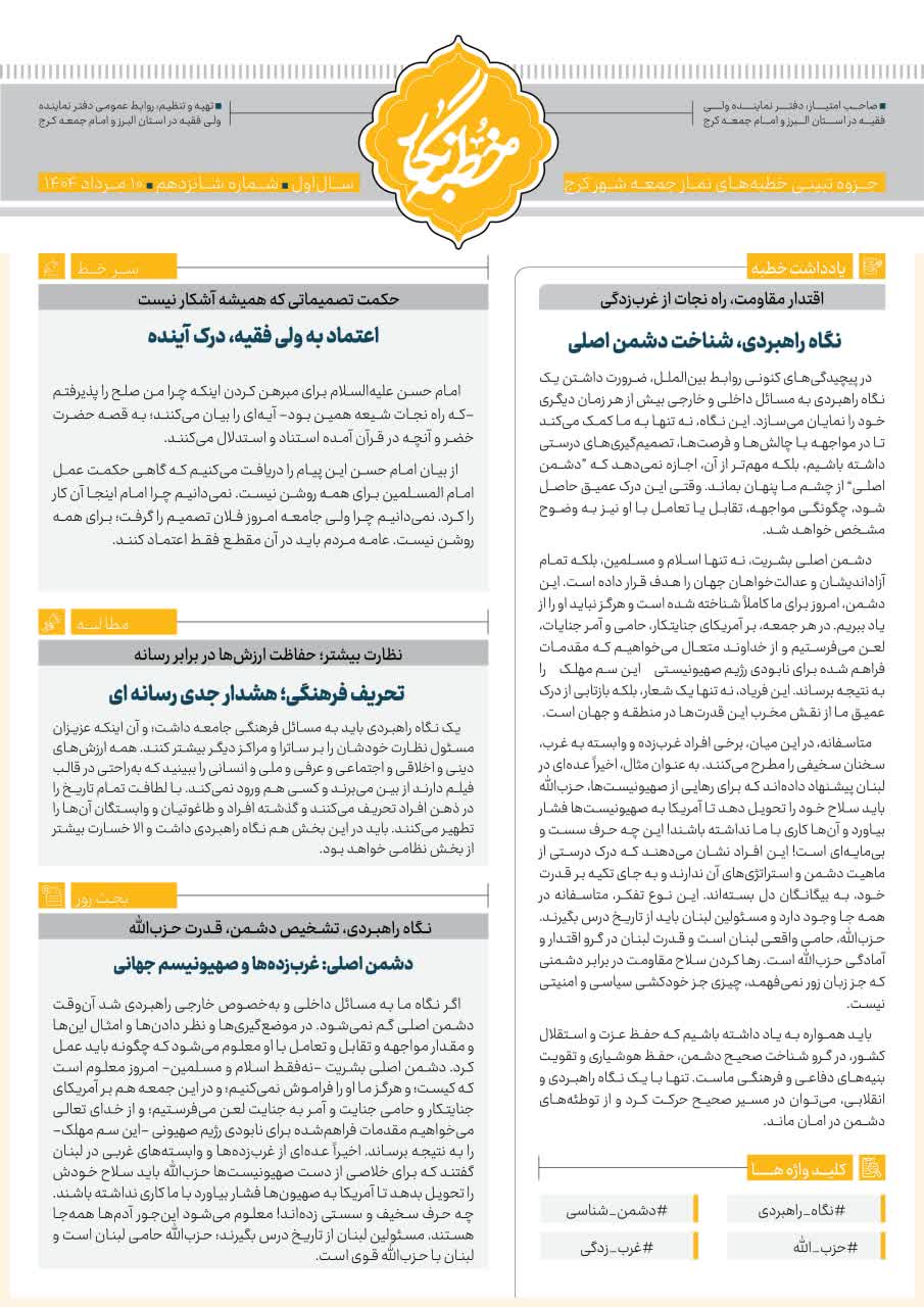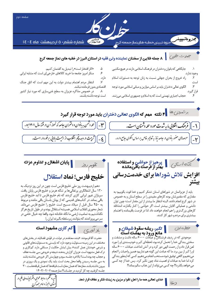 سیزدهمین شماره از خطبه نگار نماز جمعه کرج